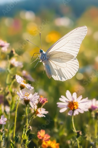 Naklejka premium A colorful butterfly flies above a vibrant field of flowers, perfect for...