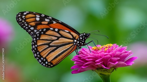© Julia, Fototapeta premium A colorful butterfly is resting peacefully on a flower that is vibrant pink
