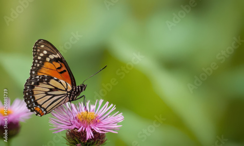 Fototapeta premium A colorful butterfly perches on a blooming flower, enjoying the sunshine