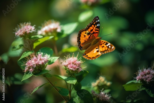 © juliars, Obraz premium A colorful butterfly perches on pink flowers with a soft, bokeh background