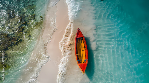 Fototapeta premium A colorful canoe on the beach, bird's eye view,high definition photography, clean white sand, clear turquoise sea water, waves lapping at shore edge,a sense of calmness in the scene