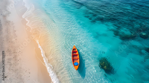 Fototapeta premium A colorful canoe on the beach, bird's eye view,high definition photography, clean white sand, clear turquoise sea water, waves lapping at shore edge,a sense of calmness in the scene