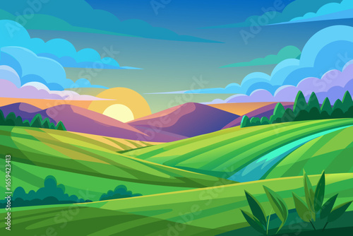 © MAYENUDDIN, Fototapeta premium a colorful cartoon landscape with rolling hills and mountains at sunset time