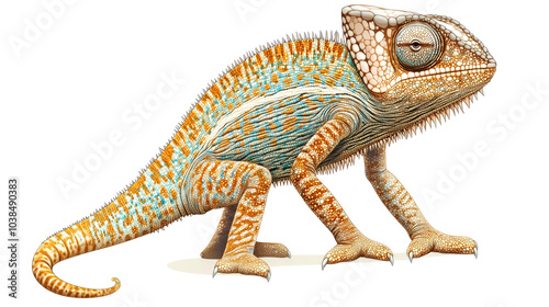 © dropideas, Obraz premium A colorful chameleon with a long tail and large eyes against a white background.
