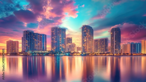 Fototapeta premium A colorful cityscape with futuristic architecture and water reflections under a dramatic sunset sky