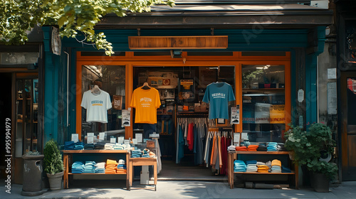 © Neural9 Project, Naklejka premium A colorful clothing store storefront with folded t-shirts on display outside, showcasing an inviting and vibrant atmosphere.