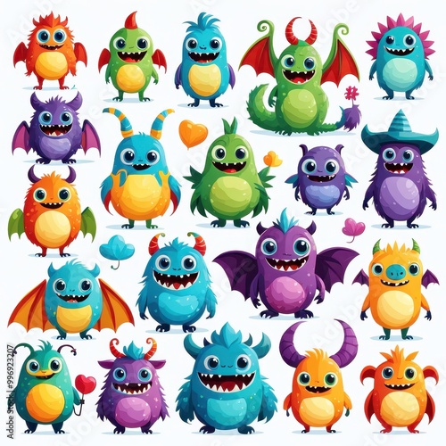 © darion, Naklejka premium A colorful collection of cartoon monsters with various features and expressions.