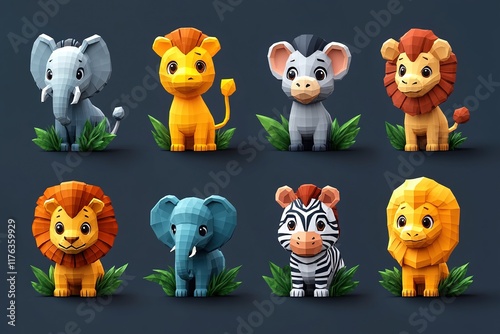 Naklejka premium A colorful collection of stylized animal figures, including elephants, lions,...