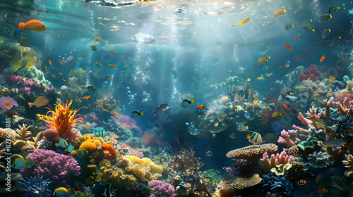 Naklejka premium A colorful coral reef teeming with marine life beneath the ocean surface