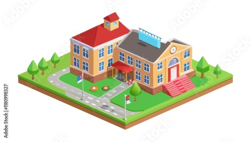 © mangolovemom, Fototapeta premium A colorful, 3D illustration of a school complex featuring two buildings, green lawns, pathways, and trees, representing an educational environment.