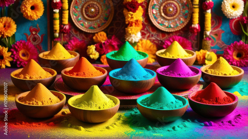 © ConceptStudio, Fototapeta premium A colorful display of powders in bowls, with a variety of colors and sizes