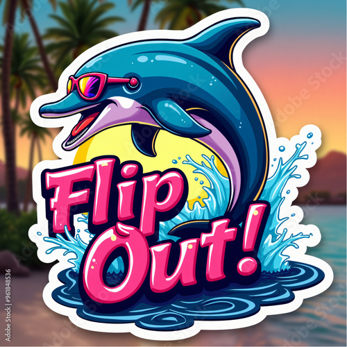 Obraz premium A colorful dolphin wearing sunglasses with the phrase "flip out!".