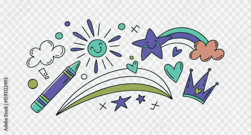 Obraz premium A colorful doodle with a crayon, rainbow, sun, and stars