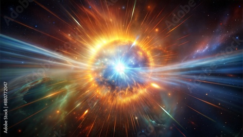 © Theevit, Naklejka premium A colorful explosion in space with a bright blue light in the center
