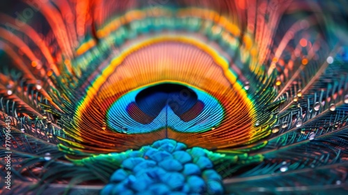 © Rattanathip, Naklejka premium A colorful feather with a blue center and red and yellow edges. The feather is wet and has a rainbow-like appearance