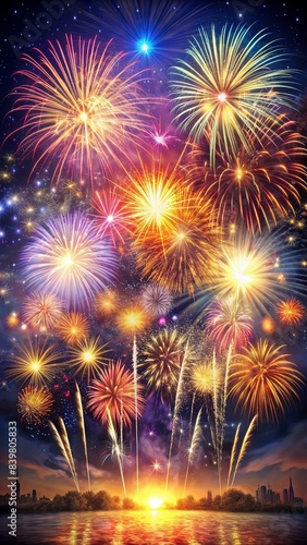 Naklejka premium A colorful fireworks display in the sky with a sunset in the background