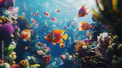 © Wongstorn, Fototapeta premium A colorful fish swimming in a coral reef with other fish