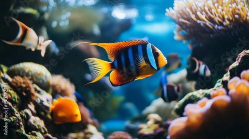 Fototapeta premium A colorful fish swims in a tank with other fish