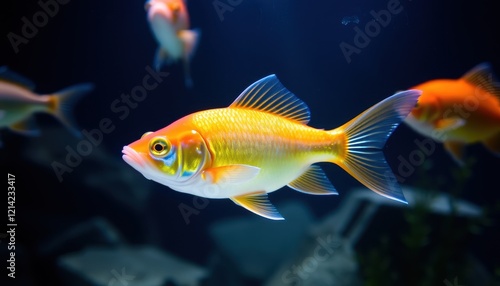 Fototapeta premium A Colorful Fish with Yellow and Orange Scales Swimming in a Dark Aquarium