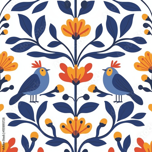© padungsak, Fototapeta premium A colorful floral pattern featuring blue birds and vibrant flowers, creating a cheerful and decorative design.