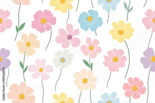 © Boinah, Naklejka premium A colorful floral pattern featuring various flowers in soft pastel shades on a white background.