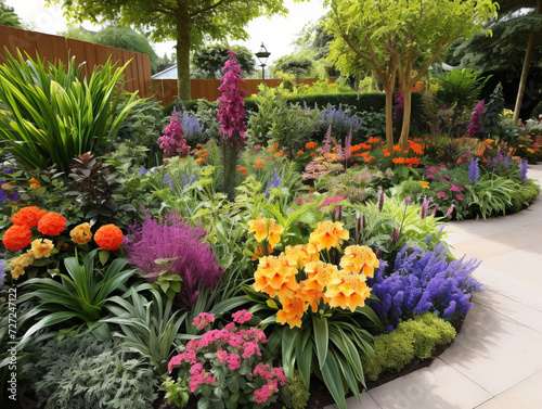 © Lotti, Fototapeta premium A colorful garden filled with blooming flowers and lush greenery, bursting with vibrant life.