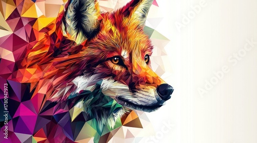 © sambath, Naklejka premium A colorful, geometrically abstract fox illustration with a white background.