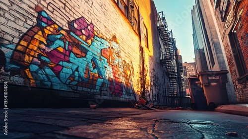 Fototapeta premium A colorful graffiti art mural on a brick wall in an alley