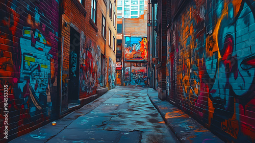 © Thiago, Fototapeta premium A colorful graffiti-covered building with a mix of bright and dark colors. Graffiti Alley. Illustration