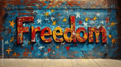 Fototapeta premium A colorful graffiti of the word freedom is painted on a brick wall