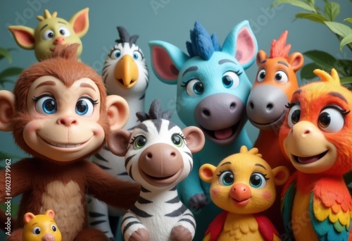 Naklejka premium A colorful group of animated animal characters smiling together in a playful...