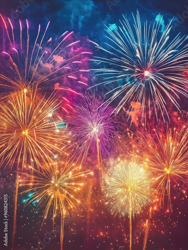© Johannes, Naklejka premium A colorful Happy New Year card filled with bright fireworks lighting up the night sky, celebrating the arrival of the new year in a joyful and festive manner