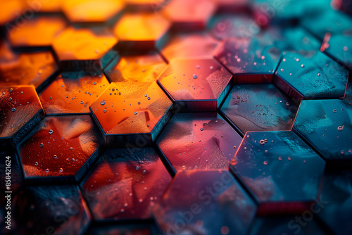 © Nando Vidal, Obraz premium A colorful hexagonal pattern with water droplets on it