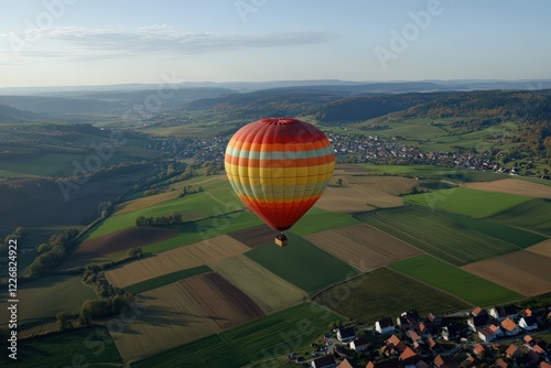 Obraz premium A colorful hot air balloon drifting over a countryside valley filled with patchwork fields