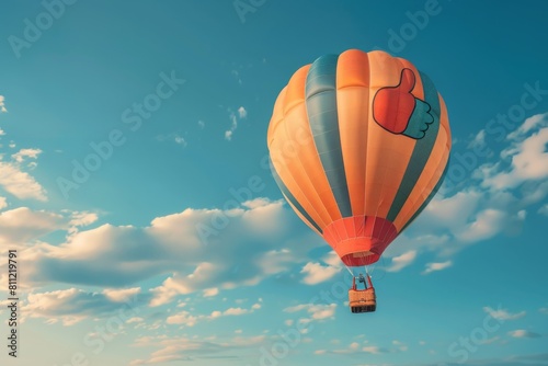 © Trichaiwat, Naklejka premium A colorful hot air balloon floats high in a blue sky with clouds, casting a red shadow on the basket below