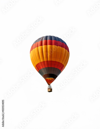 © YiuCheung, Fototapeta premium A colorful hot air balloon with a wicker basket floats against a white background.