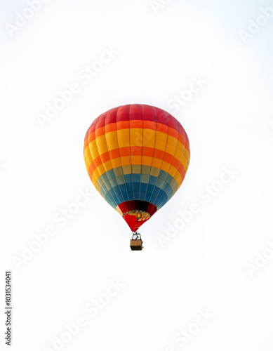© YiuCheung, Naklejka premium A colorful hot air balloon with a wicker basket floats against a white sky.