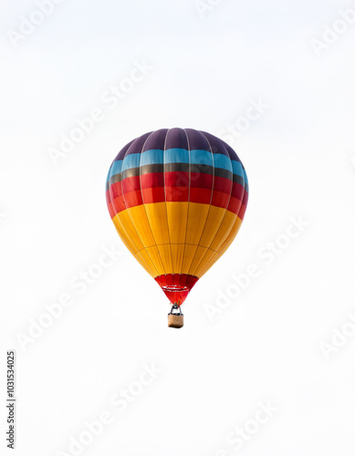 Fototapeta premium A colorful hot air balloon with a wicker basket rises against a white sky.