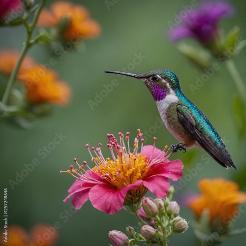 © Muhammad, Fototapeta premium A colorful hummingbird drinking nectar from a flower.