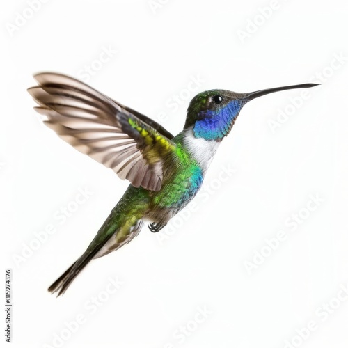 Obraz premium A colorful hummingbird gracefully flies against a white background