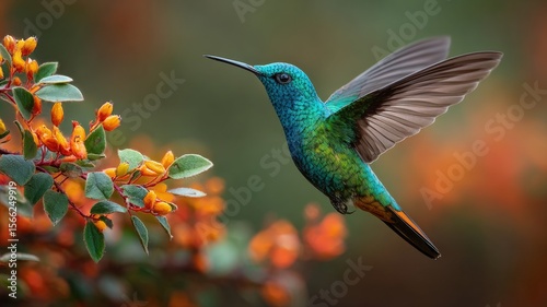 Fototapeta premium A colorful hummingbird hovering near a flower, capturing its delicate movements and vibrant plumage