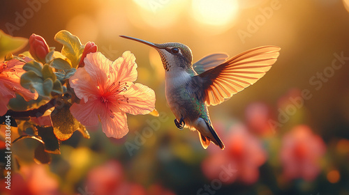 © Ambarwati, Fototapeta premium A colorful hummingbird hovering near a vibrant flower