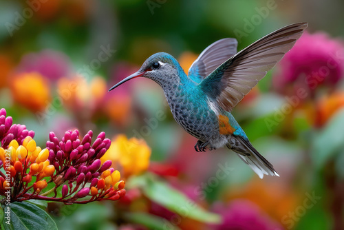 © YouraPechkin, Naklejka premium A Colorful Hummingbird Hovers Near Vibrant Flowers in a Lush Garden