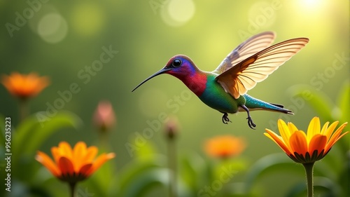 © Antonio, Fototapeta premium a colorful hummingbird is flying in front of some flowers.