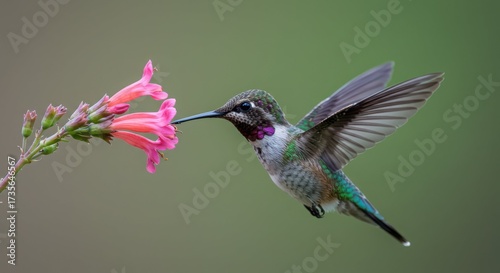 Fototapeta premium A colorful hummingbird sips nectar from a vibrant pink flower in nature