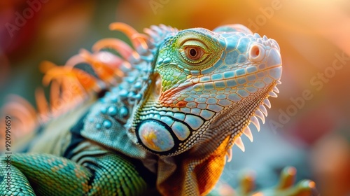 Fototapeta premium A colorful iguana is showcased basking in the warm sunlight, highlighting its...