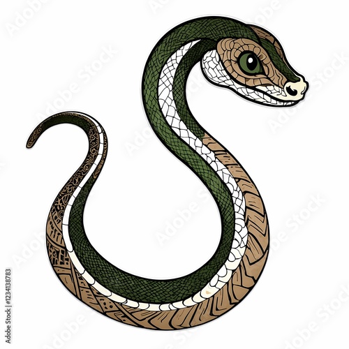 © Nataliia, Obraz premium A colorful illustrated snake with intricate patterns, showing a combination of green and brown hues in its design on a white background. Generative AI
