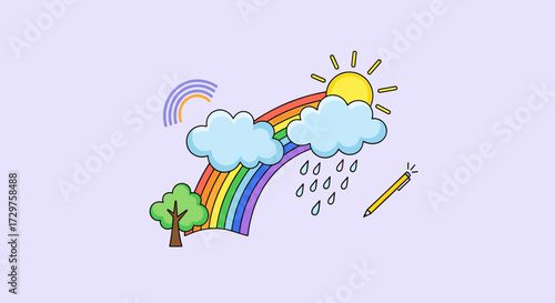 © Mitthila Vectx, Fototapeta premium A colorful illustration depicts a rainbow a tree and clouds with falling rain next to a sun and a pen.