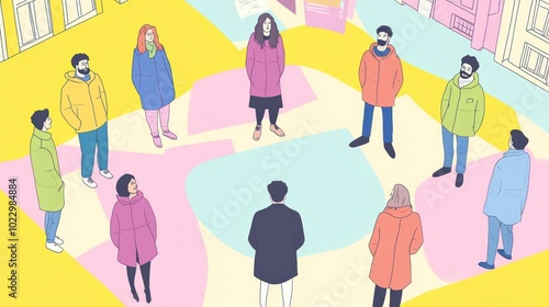 © Iswanto, Fototapeta premium A colorful illustration of diverse people standing in a circle in an urban setting.