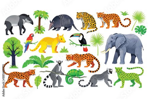 Fototapeta premium A colorful illustration of various wild animals and plants in a jungle setting